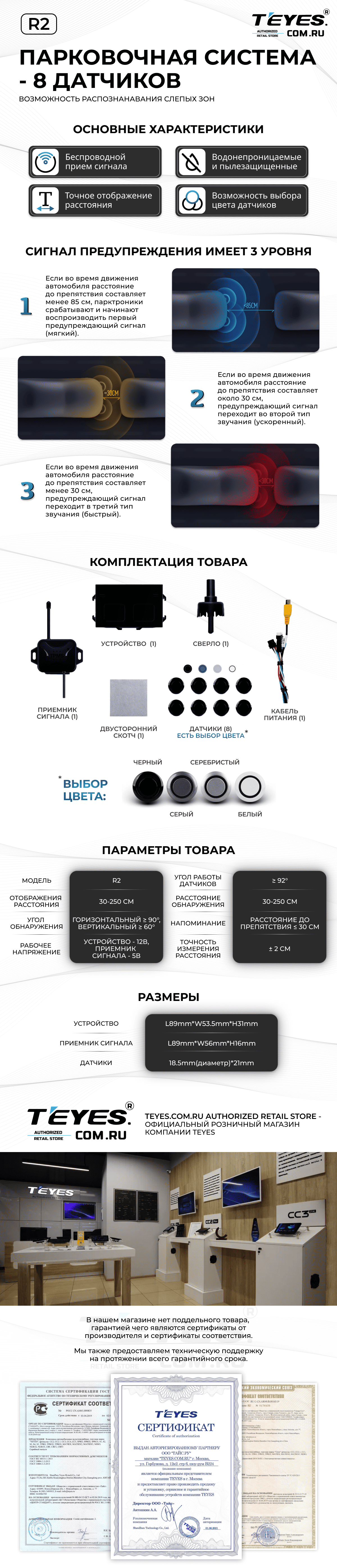 Передние и задние парктроники Teyes R2 для CC4 Pro / CC4 / CC4L / CC3 2K / CC3 / CC3L / CC2 Plus / SPRO Plus / TPRO2 / LUX ONE (Серебристые) 8-датчиков - купить всего за 19 900 руб. в интернет-магазине в Костроме Teyes.com.ru. ✓ Самый лучший выбор мультимедиа ✓ Лучшая замена штатному ГУ ✓ Тел. +7 (800) 775-31-74