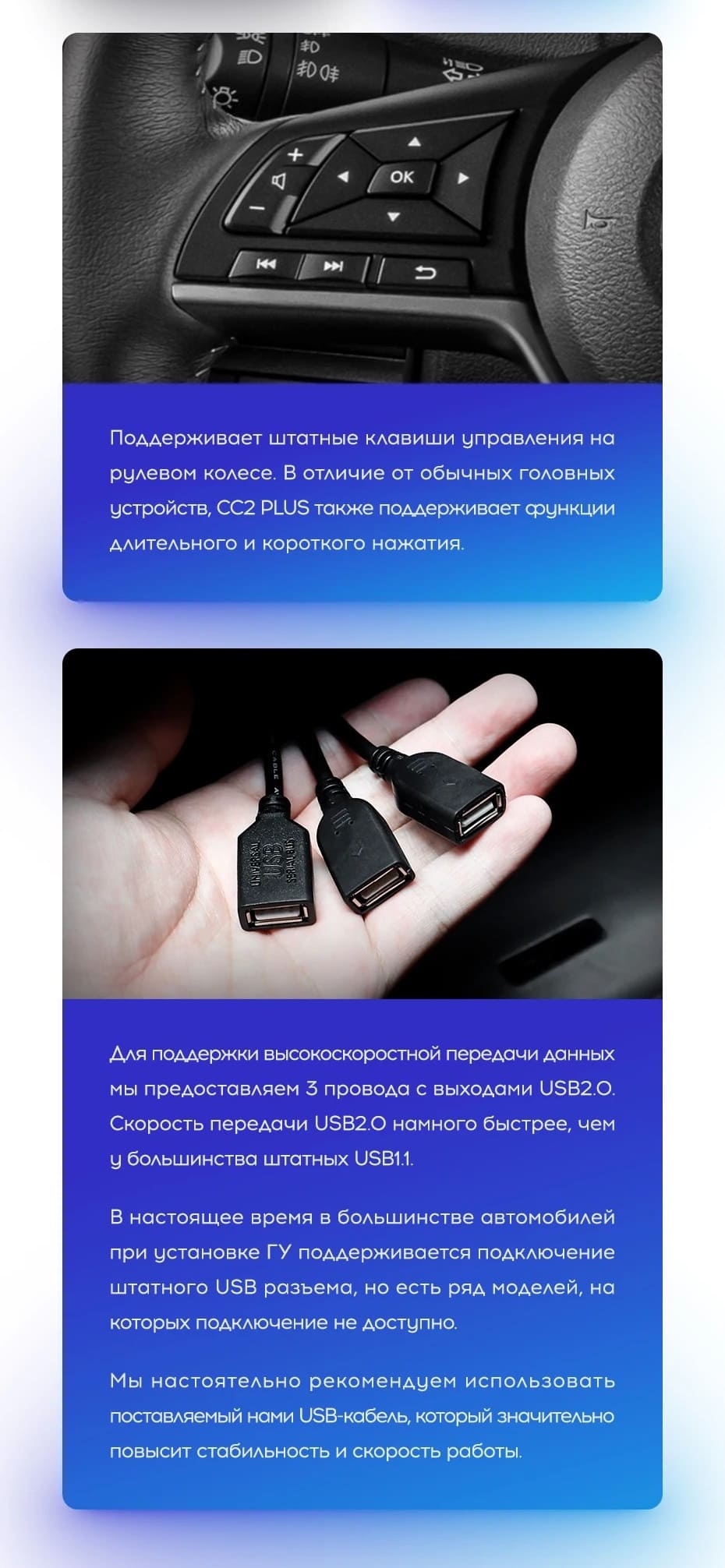 Только в линейке СС3 реализовано программное обеспечение, которое отображает трёхмерную картинку движения автомобиля. Благодаря установленному трёхосному датчику гироскопа на дисплее магнитолы отображается автомобиль в 3D-плоскости (доступны повороты 360о, динамические данные).