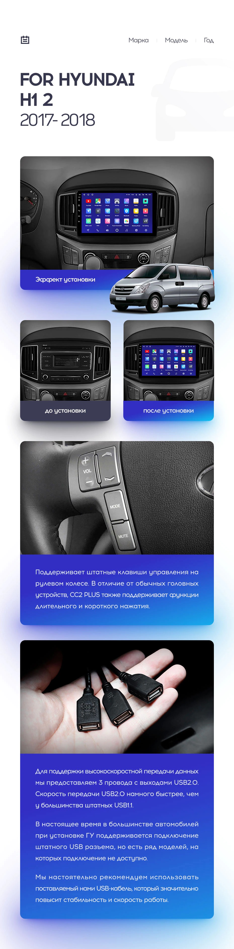 Установочный комплект для Hyundai H1 2 (2017-2018) включает переходную рамку и проводку.
