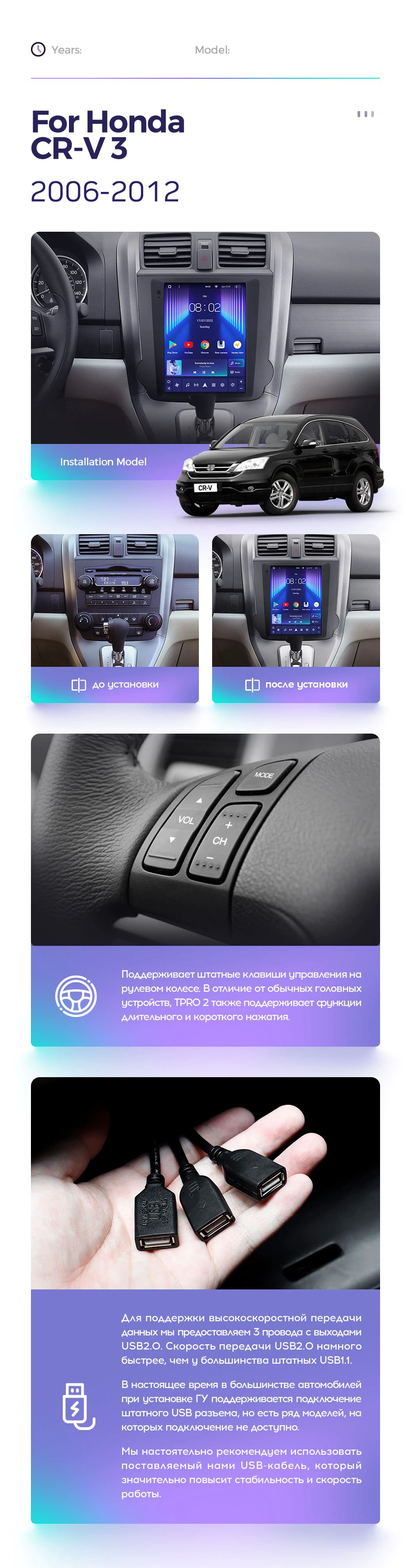 Полный комплект установки магнитолы Teyes с рамкой и проводкой можно выбрать в каталоге штатных магнитол Honda CR-V 3 RE 2006-2012.
